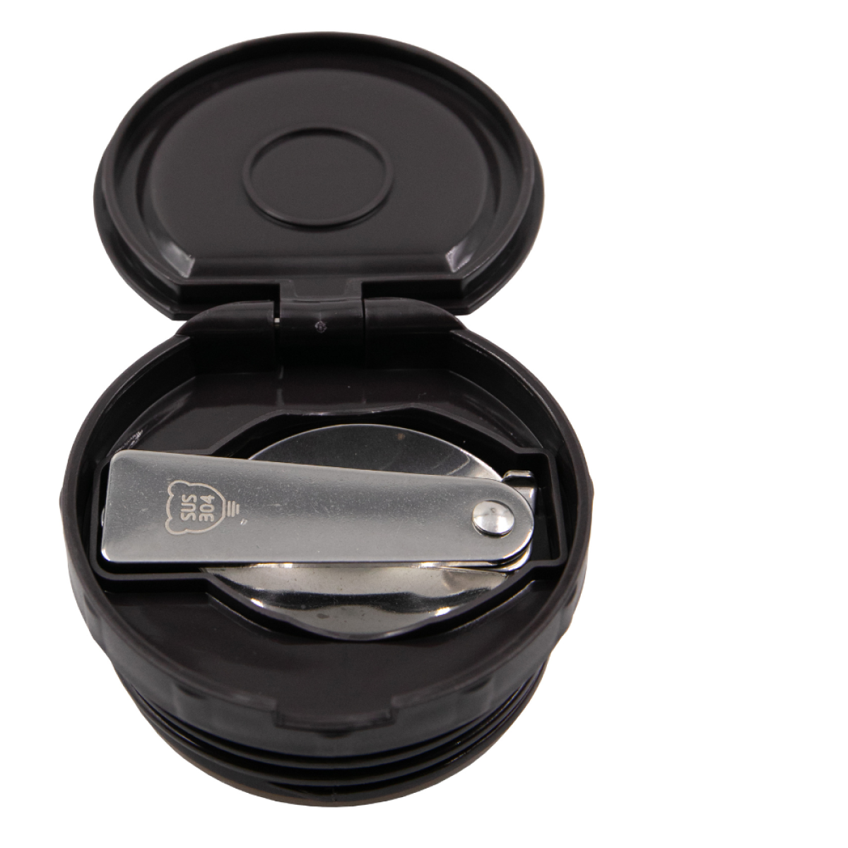 Складна ложка із нержавіючої сталі зберігається у спеціальному відсіку пробки термоса.